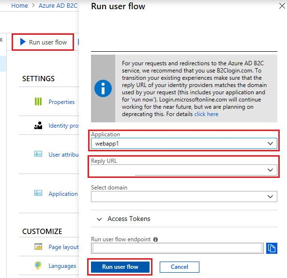 You can test your user flow by selecting the ‘Run user flow’ button at the top of your user flow settings. This opens a new window where you can walk through the experience as a user.